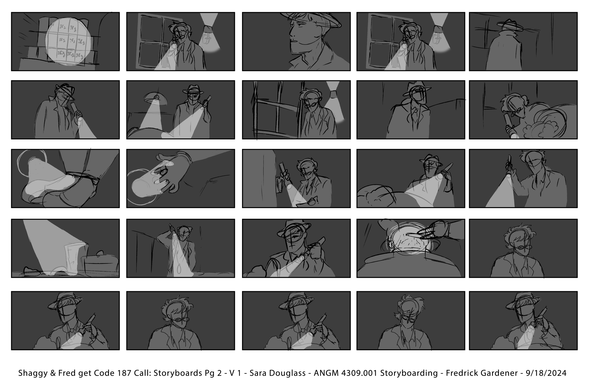 This was an assignment for my storyboarding class. We were asked to reinterpret the gluttony murder scene from the 1995 film “Se7en” with Brad Pit and Morgan Freeman replaced with Shaggy and Fred respectfully from the Scooby Doo series in a 70s cop style noir. We needed to turn the original murder victim into a clown who dies from consuming excessive amounts of frosting. And the big reveal was that in the bucket in where the murder victim vomited, there would be a big reveal of a joker card to reveal it was DC comic’s Joker who committed the murder. Original characters Shaggy and Fred belong to Warner Bros.